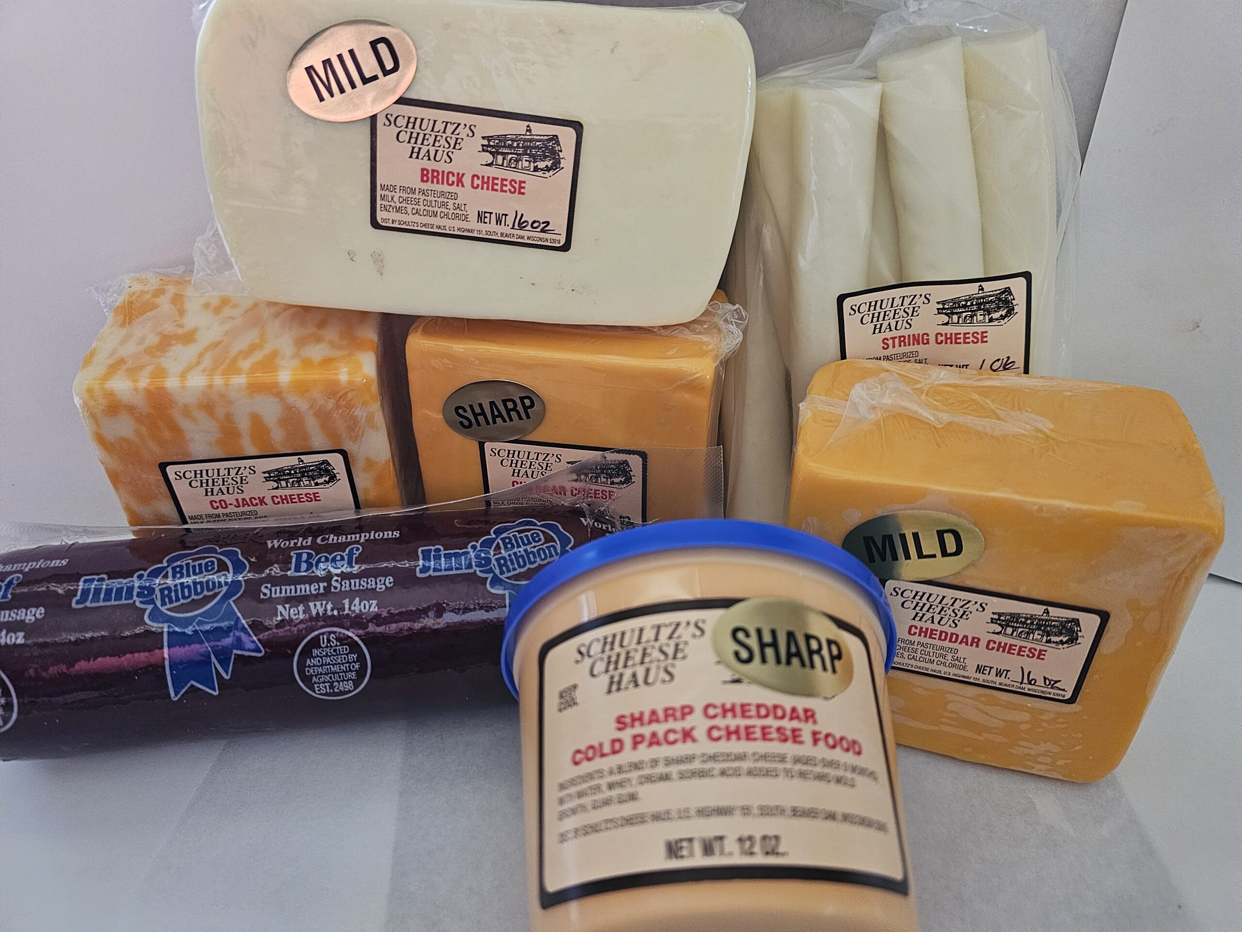 Net Wt. 7.00 lbs. 1 lb. Co-Jack, 1 lb. Mild Cheddar, 1 lb. Sharp Cheddar, 1 lb. Mild Brick, 1 lb. String Cheese, 12 oz. Sharp Cheddar Cheese Spread and a 20 oz. All Beef Sausage.