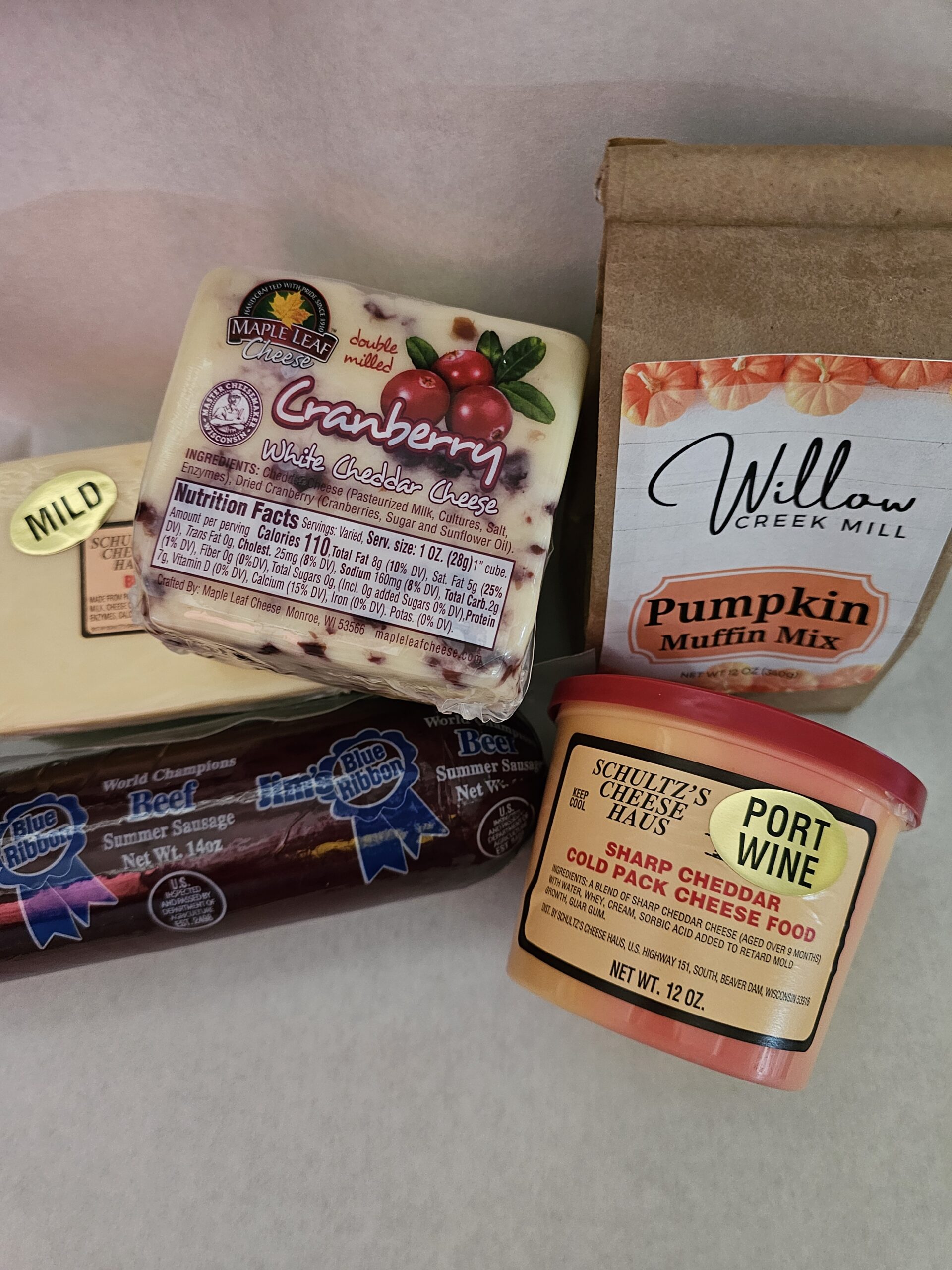 1 lb. Cranberry Cheddar, 1 lb. Mild Brick, 12 oz package Pumpkin Muffin Mix, 12 oz. Port Wine Spread, 14 oz Jim’s. All Beef Sausage. Shipping Wt. 5 lbs.